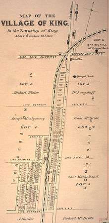 In 1836, a settlement styled Springhill was established in King.[2] With the arrival of the Ontario, Simcoe and Huron railway in 1853, the settlement began to expand. In 1890, the reeve of King township James Whiting Crossley incorporated King City by merging the hamlets of Springhill, Kinghorn, Laskay, and Eversley.[2]
