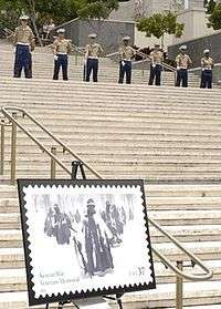 In 2002, amateur photographer and retired Marine John Alli was paid $1,500 to use one of his photographs of the memorial on a snowy day for the stamp[14] which sold more than $17 million worth of stamps. In 2006 sculptor Frank Gaylord enlisted Fish & Richardson to make a pro bono claim that the Postal Service had violated his Intellectual property rights to the sculpture and thus should have been compensated. The Postal Service argued that Gaylord was not the sole sculptor (saying he had received advice from federal sources – who recommended that the uniforms appear more in the wind) and also that the sculpture was actually architecture. Gaylord won all of his arguments in the lower court except for one—the court ruled the photo was fair use and thus he was not entitled to compensation.[15] Gaylord challenged the fair use ruling and won the case on appeal. The case could now either be appealed to the United States Supreme Court, or damages could be assessed by the United States Court of Federal Claims.[13]