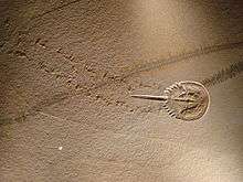 Kouphichnium is an ichnogenus that has been attributed to limulids (horseshoe crabs). Kouphichnium fossils resemble the footprints of birds, sometimes in conjunction with a medial line,[1] and were initially thought to be bird or pterosaur tracks. The footprints are now believed to be the imprints of specialized limulid appendages, called pushers, terminating in four plates, used to push against the sediment. The medial line is left by the animal's telson.
