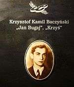 Krzysztof Kamil Baczyński, (Polish pronunciation: [ˈkʂɨʂtɔf ˈkamil baˈt͡ʂɨɲskʲi]; nom de guerre: Jan Bugaj; January 22, 1921 – August 4, 1944) was a Polish poet and Home Army soldier, one of the most renowned authors of the Generation of Columbuses, the young generation of Polish poets of whom several perished in the Warsaw Uprising and during the German occupation of Poland.