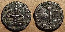 The origins of Kujula Kadphises are quite obscure, and it is usually considered he was a descendant of the Kushan ruler Heraios, or even identical with him.[1] Interestingly however, Kujula shares his name (Kushan: Κοζουλου on some of his "Hermaeus" coins, or Κοζολα on his "Augustus" coins) with some of the last Indo-Scythian rulers, such as Liaka Kusulaka (Greek: Λιακα Κοζουλο), or his son Patika Kusulaka, which might suggest some family connection.[2]