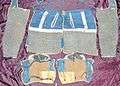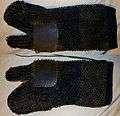 The Japanese had more varieties of mail than all the rest of the world put together.[2] Kusari was used in samurai armour at least from the time of the Mongol invasions (1270s) but particularly from the Nanboku-chō period (1336–1392).[3] Kusari was typically made with rings that were much smaller than their European counterparts, and patches of kusari were used to link together plates and to drape over vulnerable areas such as the underarm. Most common parts of samurai armour could be made with kusari as the main armour defense as well as many types of garments including jackets, hoods, gloves, vests, shin, shoulder, thigh guards, even kusari tabi socks. Kusari gusoku (chain armour) was commonly used during the Edo period 1603 to 1868 as a stand-alone defense. According to George Cameron Stone,