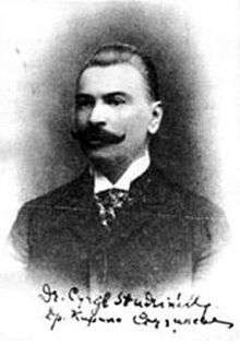 Kyryl Studynsky (Ukrainian: Кири́ло Йо́сипович Студи́нський (4 October 1868 – 1941), was a western Ukrainian political and cultural figure from the late-19th to the mid-20th century. One of the principal figures within the Christian Social Movement in Ukraine, in 1939 Studynsky became head of the People's Assembly of Western Ukraine following the Soviet annexation of Western Ukraine, 1939–1940, and led the delegation to Moscow that formally requested the inclusion of Western Ukraine to the Soviet Union.