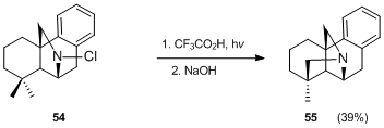 The Hofmann–Löffler–Freytag reaction was employed to synthesize the bridged nitrogen structure of (±)-6,15,16-iminopodocarpane-8,11,13-triene 55, an intermediate useful for the preparation of the kobusine-type alkaloids, from a bicyclic chloroamine 54.[33] Irradiation of 54 with a 400 W high-pressure mercury lamp in trifluoroacetic acid under a nitrogen atmosphere at room temperature for 5 h afforded a moderate yield of the product.