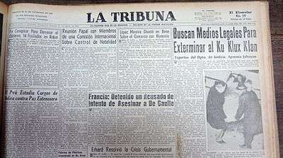 La Tribuna was one of the most important daily newspapers in Paraguay's history. It was founded in 1925 in Asunción by Eduardo Schaerer, and was the country's leading newspaper for five decades.[1] La Tribuna was the first Paraguayan paper to be widely published across the country. Politically, La Tribuna was positioned between liberalism and traditional national politics. It opposed especially the dictatorial regimes of Higinio Moríñigo and Alfredo Stroessner.[2] During these dictatorial regimes, the editors became the target of persecution.[3] Their crusade in favor of the Free Press in Paraguay gained attention abroad. In 1953, the newspaper's director, Arturo Schaerer, received the María Moors Cabot Prize from Columbia University.