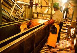 The Occupational Safety and Health Administration regulates the labor rights of workers in the American meat packing industry.[1][2] According to scholars of the American meat packing industry, despite federal regulation through OSHA and industry oversight, workers in meat production plants have little agency and inadequate protections.[1][2] Workers in the industry perform difficult jobs in dangerous conditions, and are at significant risk for physical and psychological harm.[1][2][3] In addition to high rates of injury, workers are at risk of losing their jobs when they are injured or for attempting to organize and bargain collectively.[2] Several of studies of the industry have found immigrant workers - "an increasing percentage of the workforce in the industry"[2] - especially at risk of not having their labor rights sufficiently protected.[1][2]