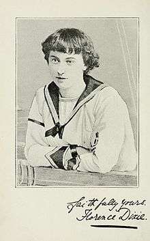 Dixie held strong views on the emancipation of women, proposing that the sexes should be equal in marriage and divorce, that the Crown should be inherited by the monarch's oldest child, regardless of sex, and even that men and women should wear the same clothes.[41] She was a member of the National Union of Women's Suffrage Societies, and her obituary in the Englishwoman's Review emphasized her support for the cause of women's suffrage (i.e. the right to vote): "Lady Florence... threw herself eagerly into the Women's Movement, and spoke on public platforms."[40][42]