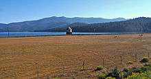 The first dam was completed by Great Western Power in 1914[1] as part of the Upper North Fork Feather River Project, damming the North Fork of the Feather River and flooding the meadow-filled valley generally known as Nakam Koyo/Big Meadows/Big Springs, a longstanding Yamani Maidu village site.[2][3] When the dam was built, Maidu families still living in the vicinity were displaced while parts of the town of Prattville had to be moved to higher ground, leaving multiple structures flooded over. The reservoir was named for the three daughters of Guy C. Earl, Vice President of Great Western Power: Alice, Martha and Eleanor.[4][5] The present dam, which more than doubled the size was constructed by Great Western Power from 1926 to 1927.