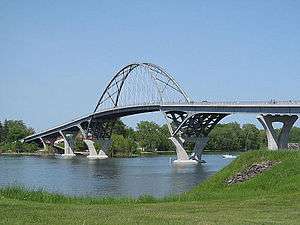 After state inspectors determined that the previous Champlain Bridge was beyond repair in 2009, the states of New York and Vermont agreed to replace it.[5] The new bridge employs a modified network tied arch design.[6] Flatiron Constructors of Longmont, Colorado, the U.S. subsidiary of the German firm, Hochtief AG, won the contract for the new bridge, and groundbreaking took place on June 11, 2010.[7] The bridge construction contract was for $69.6 million. It was completed six weeks ahead of schedule, but at a cost of $78.29 million.[4][8]