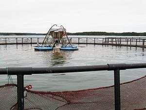 Intensive salmon farming uses open-net cages, which have low production costs. It has the drawback of allowing disease and sea lice to spread to local wild salmon stocks.[73]