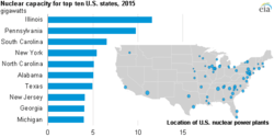 Nuclear power plant locations and nameplate capacity of the top 10 states.