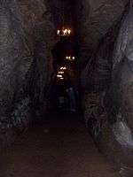 Stairs, lit with electric lights, lead into the cavern. | |