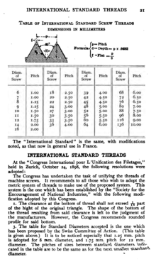 These were standardized by the International Organization for Standardization (ISO) in 1947. Although metric threads were mostly unified in 1898 by the International Congress for the standardization of screw threads, separate metric thread standards were used in France, Germany, and Japan, and the Swiss had a set of threads for watches.