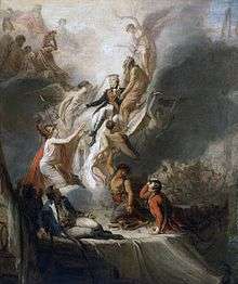 Nelson's death in the cockpit of his flagship HMS Victory has been described by Andrew Lambert as 'the ideal romantic death'.[6] He was mortally wounded by an enemy sniper, dying slowly and remaining conscious throughout, surrounded by his chaplain and staff officers. His last thoughts covered matters such as final directions for his fleet, his hopes and fears for his family, and his personal desire for absolution and reassurance.[6] The events were recorded by several of those present, including the surgeon, William Beatty, and later interpreted in dramatic paintings, both of the death scene, such as those by Benjamin West, and Arthur William Devis, and of allegorical depictions of Nelson's ascent into immortality as a result of his glorious death, including works by West, and Scott Legrand. When news arrived in Britain the initial joy at the news of the victory was stifled by the report of his death, and a state funeral was immediately planned.[7] Nelson was to be buried in St Paul's Cathedral, in a grand ceremony that was not just a mere funeral but was intended to 'capture the essence, the spirit, and the name of Nelson for the nation.'[6] A special coffin was devised, heavily decorated with emblems and symbols of Nelson's many victories. It enclosed the simpler coffin, given to Nelson by Benjamin Hallowell, and was itself enclosed in a grand sarcophagus made for Cardinal Wolsey.[8] When Nelson was laid in state at Greenwich Hospital, a crowd of 30,000 arrived to pay their respects. The subsequent funeral was one of the grandest ever staged, costing some £14,000 and attended by large numbers of admirals, captains and members of royalty.[9]