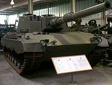 In the third stage of KWS was the planned replacement of the Leopard 2 turret by a new turret fitted with a 140 mm NPzK tank gun, an autoloader and the IFIS battlefield management system.[30] The ballistic protection at the hull was to be improved.[30] Originally a total requirement for 650 Leopard 2 tanks with KWS 3 was projected.[31] It was never finalized, but the 140 mm NPzK tank gun was tested on an older prototype. In 1995 it was decided to cancel due to changes in the political environment. The funds were redirected to the NGP project of the German army. The Leopard 2A6M was developed with an enhanced mine-protection kit providing protection against mines that can detonate below the hull (like mines with bending wire trigger) and EFP mines.[31] The weight of the Leopard 2A6M is 62.5 tonnes.[33]