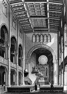 The interior featured horseshoe arches, an Aron Kodesh in the style of a mihrab and a pulpit in the style of a mimbar.[2] Because so many businessmen gathered in Leipzig for the fairs, the synagogue is thought to have influenced the decision to build Moorish revival synagogues in other cities.