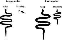 Small species of snake such as L. carlae have relatively large new-born offspring compared to adults. The offspring of the largest snakes are only one-tenth the length of an adult, whereas offspring of the smallest snakes typically are one-half the length of an adult (see figure below). The tiny snakes produce only one, massive egg—relative to the size of the mother.