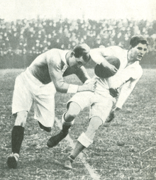 The first rugby competition was held in 1892 as a one-off championship game between two Paris-based teams, the Racing Club de France and Stade Français. In 1900 rugby was played at the Paris Summer Olympics. France won the gold medal of the first ever rugby event at the Olympics. Racing Club made it to the championship final on 31 March 1912. France joined an international competition in 1910, and coined the term Tournoi des Cinq Nations (Five Nations Championship); a term that would last almost the entire century.[13] On 1 January 1913, at the France-Scotland match, spectators threw themselves on the referee to express their dissatisfaction. The mounted police were forced to intervene charging. This violent incident led to the secretary of the Scottish Rugby Union to declare: "If the game can only be played under the protection of the police or the military, it is not worth playing".[14] Following this incidents, Scotland refused to face France at the 1914 tournament.[15] France was implicitly excluded from further tournaments, but World War I did not permit the application of this exclusion.