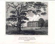 Danbury Place, near Danbury, Essex, was a country house built by Walter Mildmay, and his second son Humphrey Mildmay resided there.[36] It came to Disney Fytche, through his wife's uncle Thomas Fytche.[1] He tried to sell it in 1812, to John Goslin, the deal foundering on bad debts.[37] Lady Hillary, divorced from her husband by 1812, continued to live at Danbury Place until her father died, then moving to Boulogne.[38]