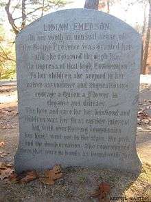 On the other hand, Lidian always referred to her husband as "Mr. Emerson", reflecting "New England reserve" rather than lack of affection.[8] Lydia Jackson's name is "Lidian" on her tombstone in Sleepy Hollow Cemetery.