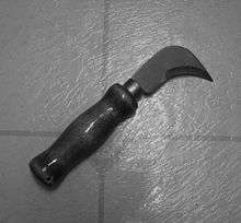 A linoleum knife (also called a banana knife or hook axe)[1] is a small knife that has a short, stiff blade with a curved point and a handle and is used to cut linoleum[2] or other sheet materials such as wood panelling[3] and veneer[4] and sheet mica.[5] The knife is similar in design to the sickle and billhook. Like most cutting tools with hooked blades, the purpose of this design is to cut by pulling. This helps to reduce the wasted effort of simultaneously pressing the blade into the item as one would with a straight blade. It also allows the user to reach out and cut an item with the arm fully extended, such as during plant trimming or harvesting, or making a long continuous cut into a surface. This tool can also be used to pick locks by bypassing the safety latch in the doorjamb.[6] Knives of a similar shape and design are commonly used by carpet fitters.
