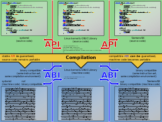 The term Linux ABI refers to a kernel–user space ABI. The Application binary interface refers to the compiled binaries, in machine code. Any such ABI is therefore bound to the instruction set. Defining a useful ABI and keeping it stable is less the responsibility of the Linux kernel developers or of the developers of the GNU C Library, and more the task for Linux distributions and Independent software vendor (ISVs) who wish to sell and provide support for their proprietary software as binaries only for such a single Linux ABI, as opposed to supporting multiple Linux ABIs.