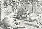 "One of the dogs, which was the first to be sent in the cage, was soon put out of action by the lion, which seized it by the head and neck and dragged it through the cage. A second dog was sent in and met with the same fate. The third, however, which came to its aid, immediately seized the lion by the lower jaw and gripped it securely for a considerable time until, severely injured by the lion's claws, it was forced to loosen its grip. The lion itself was injured in the fight and did not wish to continue fighting. With a sudden mighty leap over the dogs, it fled inside its den. Two of the dogs died shortly after the fight from the injuries they had suffered. The last, however, survived this splendid fight and was nursed back to health with great care by the King's son, Henry Frederick, Prince of Wales. Prince Henry declared: 'He had fought the king of the wild animals and should never again have to fight baser creatures!' In this way, the dog had gained for itself a safe life at the English Royal court."