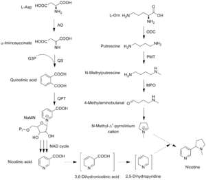 - ↑ Dawson, R. F.; Christman, D. R.; d'Adamo, A.; Solt, M. L.; Wolf, A. P. (1960). "The Biosynthesis of Nicotine from Isotopically Labeled Nicotinic Acids1". Journal of the American Chemical Society. 82 (10): 2628–2633. doi:10.1021/ja01495a059.