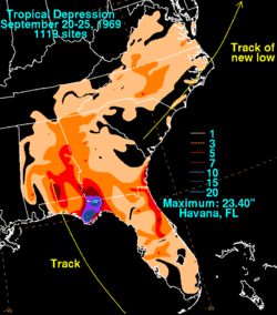 - September 21, 1969– A tropical depression moves ashore along the western Florida Panhandle, before stalling. It becomes the wettest known tropical cyclone for the eastern Florida panhandle, when 23.40 inches (594 mm) falls at Havana.[40]
