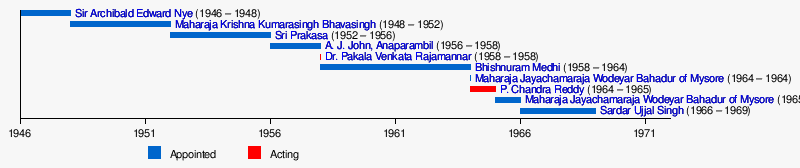 - ↑ This term is a continuation of the Jayachamaraja Wodeyar Bahadur's first term. P. Chandra Reddy served as the acting Governor while Jayachamaraja Wodeyar Bahadur was on foreign tours.
