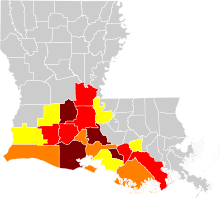 French spread in Louisiana. Parishes marked in yellow are those where 4–10% of the population speak French or Cajun French at home, orange 10–15%, red 15–20%, brown 20–30%.