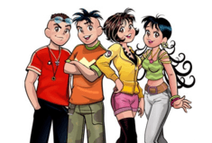 From left to right, the main characters are: Smudge, Jim Five (formerly Jimmy Five), Monica and Maggie.