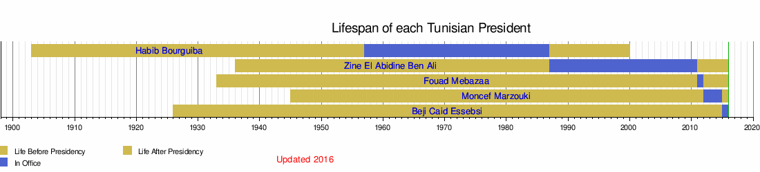 | 1 | Habib Bourguiba | August 3, 1903 | July 25, 1957 | 53 years, 356 days | November 7, 1987 | 84 years, 96 days | 4,534 days | April 6, 2000 | 35,311 days (96 years, 247 days) |