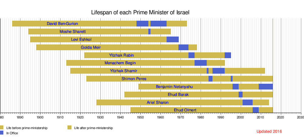 This is a graphical lifespan timeline of Prime Ministers of Israel. The prime ministers are listed in order of office.