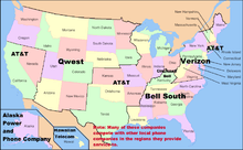 Remaining RBOC map as of 2005. Note that Qwest is now CenturyLink, BellSouth is now AT&T, and AT&T in Connecticut (formerly SNET) is now Frontier.
