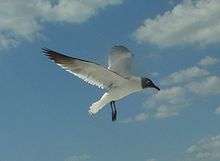 Frigatebirds are large seabirds usually found over tropical oceans. They are large, black or black-and-white, with long wings and deeply forked tails. The males have colored inflatable throat pouches. They do not swim or walk and cannot take off from a flat surface. Having the largest wingspan-to-body-weight ratio of any bird, they are essentially aerial, able to stay aloft for more than a week.