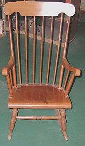 - Rocking chair (rocker), typically a wooden sidechair or armchair with legs mounted on curved rockers, so that the chair can sway back and forth; sometimes the rocking chair is on springs or on a platform (a "platform rocker") to avoid crushing anything, particularly children's feet or pets' tails, that get under the rocker
