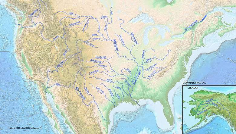 The main stems of 38 rivers in the United States are at least 500 miles (800 km) long. The main stem is "the primary downstream segment of a river, as contrasted to its tributaries".[1] The United States Geological Survey (USGS) defines a main-stem segment by listing coordinates for its two end points, called the source and the mouth. Well-known rivers like the Atchafalaya,[2] Willamette,[3] and Susquehanna[4] are not included in this list because their main stems are shorter than 500 miles.