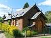 Building materials vary, but many churches are built of local stone. Brownish Bargate stone from the southwest of the county—"tougher, coarser and more durable than Reigate stone" (also known as firestone)[30]—was used at Buckland,[20] Capel[31] and the Roman Catholic church in Dorking.[32] Among the churches with firestone walls are Brockham (in which it is combined with limestone dressings, giving a polychromatic effect)[33] and Oakwood Hill.[34] Also common, especially on the oldest churches, is flint. This was usually used on its own; the chequerboard pattern of flint and stone squares common in other parts of England is seen at only two Surrey churches, both in Mole Valley: Leatherhead and Mickleham.[35] At the latter, clunch is the other part of the chequerboard pattern.[36] Clunch is also used at Betchworth, along with chalk;[13] and that material (quarried extensively in east Surrey)[35] is also found in the walls of the church at Oakwood Hill[34] and internally at Fetcham and Great Bookham.[35] Ashlar formed from the soft, easily workable stone of the Upper Greensand beds, was commonly used for dressings, quoins and similar.[37] Horsham Stone, a type of sandstone, is often used as a tiling material on roofs.[38] Some places of worship are entirely different in materials and origins, though. A converted cattle shed donated by Sir Benjamin Collins Brodie, 1st Baronet of Broome Park[25] serves as a gospel hall in Betchworth;[39] a timber-framed barn in Westhumble is now used as a chapel of ease to nearby Mickleham's parish church;[40] and Providence Chapel at Charlwood was transported to its isolated site in 1816 from Horsham,[41] where it had been used as an officers' mess during the Napoleonic Wars. The remarkable building, which with its open verandah and white-painted wooden walls "would not be out of place in the remotest part of East Kentucky" in the words of Ian Nairn and Nikolaus Pevsner,[42] served Independent Calvinists and Strict Baptists at various times, but as of 2016 is up for sale.[43]
