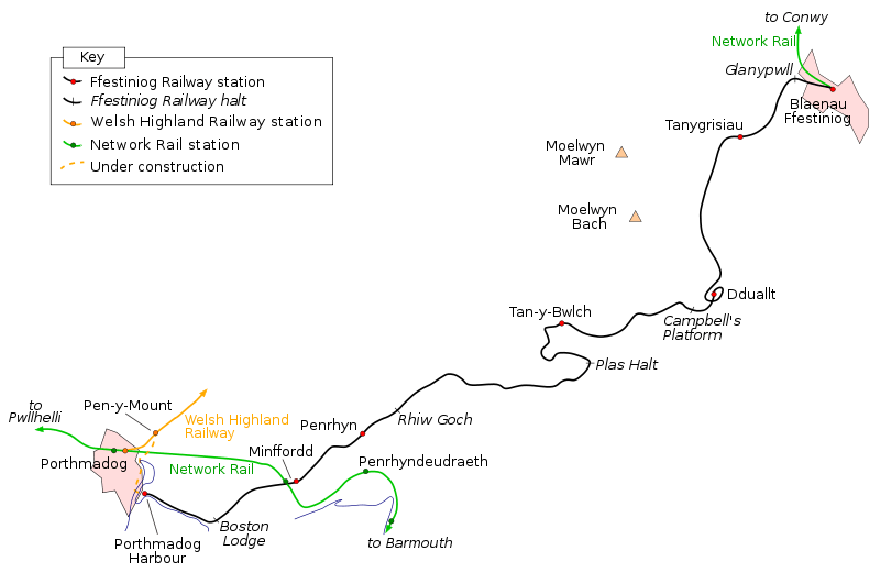 | Boston Lodge | Boston Lodge | 1928 | Open | 1 mile 5 chains (1.71 km) | Temporary terminus 23 July 1955 to end of 1955 season. Used as required mainly by staff. | |