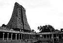 The Vimana is flanked on either side by small temples; the one in the north now housing the Goddess is fairly well preserved. The small shrine of Chandikesvara is near the steps in the north. In the north-east are a shire housing Durga, a well called lion-well (simhakeni) with a lion figure guarding its steps and a late mandapa housing the office. Nandi is in the east facing the main shrine. In the same direction is the ruined gopura, the entrance tower. The main tower surrounded by little shrines truly presents the appearance of a great Chakravarti (emperor) surrounded by chieftains and vassals. The Gangaikondacholapuram Vimana is undoubtedly a devalaya chakravarti, an emperor among temples of South India.[38]