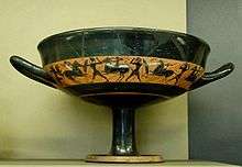 Little-master cups are a type of Attic black-figure cups, produced around the middle and third quarter of the sixth century BC. Their name is based on their fine small-format decoration. Little-master cups are later in origin than Siana cups, but both types were produced over a considerable period of time. The Little masters painted only the small upper frieze above the carination of the cup, at times also the lip or handle areas. It is probably that only few of the painters of Siana cups also painted Little-master cups. One of the first artists to introduce the Little-master cup in Athens was Kleitias. The change in decoration went along with a lengthening of the cup foot. The dedicated painters of Little-master cups rarely painted larger formas, whereas painters primarily specialised in large vases are known to also have painted Little-master cups. Stylistic comparison between larger and smaller formats of the period remains difficult.