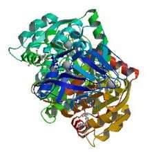 The first-ever isolated alcohol dehydrogenase (ADH) was purified in 1937 from Saccharomyces cerevisiae (brewer's yeast).[10] Many aspects of the catalytic mechanism for the horse liver ADH enzyme were investigated by Hugo Theorell and coworkers.[11] ADH was also one of the first oligomeric enzymes that had its amino acid sequence and three-dimensional structure determined.[12][13][14]