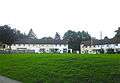 - Cefn Bryntalch. The house of 1867–69 by G F Bodley is an important early example of the Queen Anne revival. The house was completed by Philip Webb. The client was Richard Jones, who had made a fortune in the flannel trade. The exterior is of cleanly detailed and well-executed in red brick, with prominent string-courses. The south front with three big gables and a balance of irregular chimneys and near-regular windows, and many C18 features - a hipped roof, two bays, sash-windows, and the central Venetian window. The symmetrical entrance front is rather a C17 vernacular -the west front is picturesque and irregular in contrast, an asymmetrical gable anchored by a shafted chimney; lower tile-hung wing. The interior is neo-Georgian, though the plan is arranged with the main sides at r. angles. The rear Courtyard has one side-a low service range extends from the house, with a stringcourse, and pediment over the doorway. At the North end, a large barn with timber-framing picturesquely closes the vista.[41]