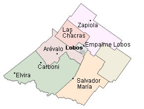 The administrative area is as web divided into seven quarters: Arévalo, Carboni, Elvira, Empalme Lobos, Las Chacras, Salvador María and Zapiola.