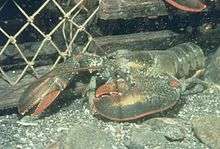 The most important lobster species on the West Coast of the United States is the California spiny lobster, Panulirus interruptus.[15] Recreational lobster fishers in California must abide by a legal catch limit of seven lobsters per day and a minimal catch size of 3¼ inch long body measured from the eye socket to the edge of the carapace.[16] The sport season for California spiny lobster starts on the Saturday preceding the first Wednesday in October through to the first Wednesday after the 15th of March.[16] Commercial fishers use lobster traps.[17]