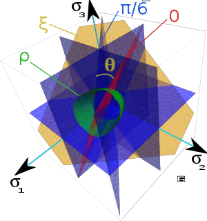 The term Haigh-Westergaard space is ambiguously used in the literature to mean both the Cartesian principal stress space[12][13] and the cylindrical Lode coordinate space[14][15]