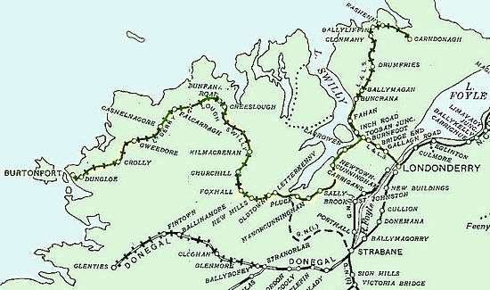 Foyle Road Station, Middle Quay and Graving Dock Stations to Pennyburn level crossing, all in Derry where the depot was. Then west into Inishowen to Galliagh Road, Harrity's Road (approximate site of border between NI and the Republic), Bridge End, Burnfoot and Tooban Junction. At Tooban Junction (as the name implies) the railway branched, north into Inishowen and south into County Donegal proper. Northwards it ran through Inch Road, Fahan, Buncrana, Ballymagan, Kinnego, Drumfries, Meendoran, Clonmany, Ballyliffin, Rashenny, Carndoagh Halt, and Carndonagh. Southwards it ran through Carrowen (near Farland Point), Newtowncunningham, Sallybrook, Manorcunningham, Pluck, Letterkenny, Oldtown, New Mills, Fox Hall, Churchill, Kilmacrenan, Barnes Halt, Creeslough, Dunfanaghy Road, Falcarragh, Cashelnagore, Gweedore, Crolly, Kincasslagh Road, Dungloe and terminating in Burtonport.