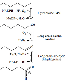 This enzyme can be induced in many Candida yeast strains[5] by growing them on long-chain alkanes as the major food source.[4] Long-chain fatty alcohol oxidases participate in omega-oxidation of long chain alkanes or fatty acids. The alkane is first oxidized to an alcohol by an enzyme of the Cytochrome P450 family using NADPH. This alcohol is oxidized by long-chain fatty alcohol oxidase in yeast.[5]