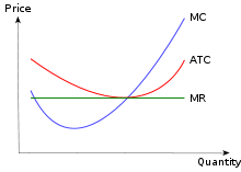 A short-run marginal cost curve graphically represents the relation between marginal (i.e., incremental) cost incurred by a firm in the short-run production of a good or service and the quantity of output produced. This curve is constructed to capture the relation between marginal cost and the level of output, holding other variables, like technology and resource prices, constant. The marginal cost curve is usually U-shaped. Marginal cost is relatively high at small quantities of output; then as production increases, marginal cost declines, reaches a minimum value, then rises. The marginal cost is shown in relation to marginal revenue (MR), the incremental amount of sales revenue that an additional unit of the product or service will bring to the firm. This shape of the marginal cost curve is directly attributable to increasing, then decreasing marginal returns (and the law of diminishing marginal returns). Marginal cost equals w/MPL.[1]:191 For most production processes the marginal product of labor initially rises, reaches a maximum value and then continuously falls as production increases. Thus marginal cost initially falls, reaches a minimum value and then increases.[2]:209 The marginal cost curve intersects both the average variable cost curve and (short-run) average total cost curve at their minimum points. When the marginal cost curve is above an average cost curve the average curve is rising. When the marginal costs curve is below an average curve the average curve is falling. This relation holds regardless of whether the marginal curve is rising or falling.[3]:226